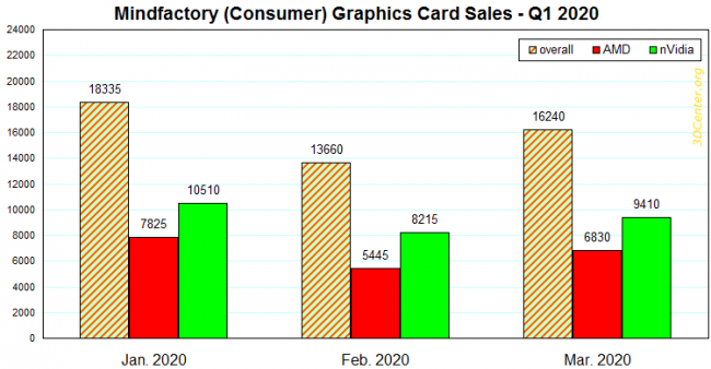 Если говорить о помесячной динамике, с которой нас знакомит немецкий ресурс 3DCenter, то февраль характеризовался минимальным количеством проданных за квартал видеокарт. Март продемонстрировал некоторое оживление спроса, но до уровня января подняться не смог. По количеству проданных видеокарт март уступил январю на 11 %, в показателях выручки — на 3 %. В целом по кварталу заметного влияния коронавируса не прослеживается, здесь уместнее говорить о каких-то сезонных явлениях. Фактически, средняя цена реализации видеокарт данным магазином даже выросла на 9,3 %, хотя здесь могли оказать влияние и изменения курса евро. Возросла доля более современных видеокарт типа Turing и Navi, а они отличаются более высокими ценами.