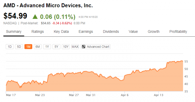 Только на этой неделе компания AMD определилась с датой публикации квартальной отчётности — она выпадает на 28 апреля. Никаких заявлений по поводу необходимости пересмотреть прогноз по выручке из-за коронавируса на протяжении всего квартала озвучено не было. При общем падении фондового рынка акциям AMD удаётся демонстрировать умеренный рост.