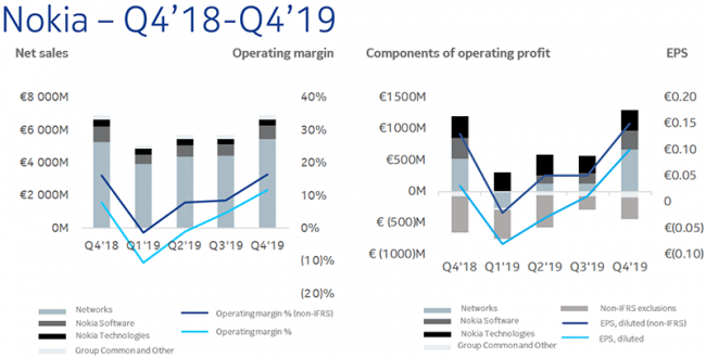 За прошлый года выручка Nokia составила €23,315 млрд, а операционная прибыль — €485 млн. Таким образом, в 2019 году компания смогла повысить доходы и выйти из убытков в прибыль. Глядя на результаты, очевидно, что Nokia находится в хорошем финансовом положении. Тем не менее, многих инвесторов беспокоит тот факт, что Nokia не только отстаёт от конкурентов в сегменте 5G-оборудования в части выручки и доли рынка, но и по объёму инвестиций, что может повлиять на конкурентоспособность Nokia Networks в перспективе.
