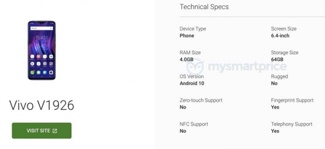 Устройство фигурирует под кодовым обозначением V1926. На коммерческий рынок эта модель, как ожидается, выйдет под именем Vivo Y21 2020.