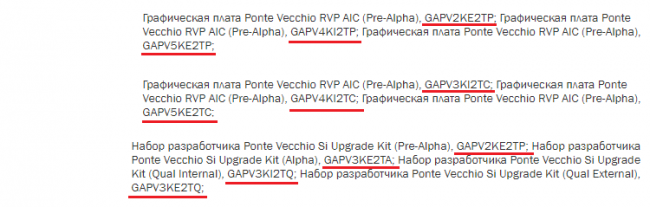 Есть у декларируемых образцов и свои артикулы: GAPV2KE2TP, GAPV4KI2TP, GAPV5KE2TP, GAPV3KI2TC, GAPV4KI2TC и GAPV5KE2TC. Этим ограничивается перечень изделий, конструктивно напоминающих графическую плату. Третий блок посвящён описанию наборов для разработчика, которые имеют артикулы GAPV2KE2TP, GAPV3KE2TA, GAPV3KI2TQ, GAPV3KE2TQ. Первый из них совпадает с одним из артикулов графических плат, упоминаемых выше. Скорее всего, конструктивно все эти изделия напоминают видеокарты, просто в комплекте для разработчиков к ним прилагается что-то ещё.