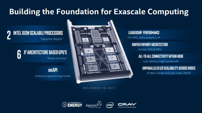 Ускорители Ponte Vecchio предложат прогрессивные компоновочные решения. Скоростная память с условным обозначением Rambo Cache будет иметь пространственную компоновку Foveros, а подложка EMIB позволит расположить в непосредственной близости от графических процессоров микросхемы памяти типа HBM2. Судя по ранним иллюстрациям из презентаций Intel, платы серии Ponte Vecchio будут многопроцессорными. В одном серверном корпусе таких плат может насчитываться до шести штук. Упоминаемые в базе данных ЕЭК образцы могут предназначаться разработчикам программного обеспечения Intel, базирующимся в Нижнем Новгороде.