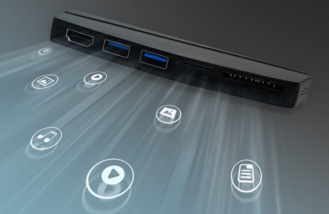 Предусмотрены слоты для карт форматов microSD и SD. Для подключения периферии доступны два порта USB 3.1 Type-A, симметричный порт USB Type-C и интерфейс HDMI с поддержкой видеоматериалов в формате 4К со скоростью 60 кадров в секунду.