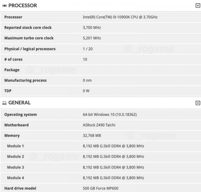 Процессор Core i9-10900K обладает десятком ядер, которые работают на 20 вычислительных потоков. Базовая тактовая частота чипа составляет 3,7 ГГц, тогда как максимальная частота в динамическом разгоне будет достигать 5,3 ГГц (благодаря технологии Thermal Velocity Boost). Однако в тесте 3DMark Time Spy, результат которого «утёк» в интернет, процессор динамически смог разогнаться только до 5,2 ГГц.
