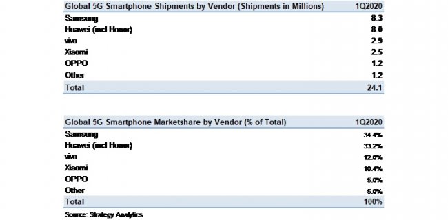 Крупнейшим производителем смартфонов с поддержкой 5G по итогам первого квартала стала компания Samsung с 8,3 млн реализованных устройств. Доля южнокорейского производителя составила 34,4 %.