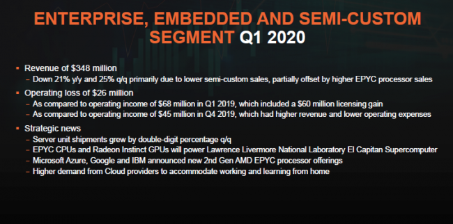 В абсолютных показателях выручка подразделения AMD, которое отвечает за серверные процессоры, не очень впечатляет. В совокупности с компонентами для игровых консолей этот бизнес в первом квартале принёс компании только $348 млн или 20 % выручки, а операционные убытки в размере $26 млн не добавили отчёту убедительности, но с реализацией процессоров EPYC у компании всё хорошо.