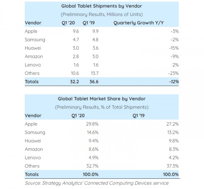 Компания Strategy Analytics оценила расстановку сил на мировом рынке планшетов по итогам первого квартала текущего года: отрасль показала очередной спад — сокращение глобальных поставок зафиксировано на уровне 12 %. Если в первой четверти прошлого года было реализовано приблизительно 36,6 млн планшетных компьютеров, то теперь — 32,2 млн. Отмечается, что влияние на отрасль оказали новый коронавирус и общий экономический спад. Крупнейшим поставщиком планшетов по итогам минувшего квартала стала компания Apple с долей почти 30 % — 29,8 %. Отмечается, что столь высокий результат «яблочная» империя показала впервые с 2013 года. На втором месте в рейтинге ведущих производителей находится Samsung с 14,6 % рынка. Замыкает первую тройку Huawei — 9,4 %. Далее идут Amazon и Lenovo с результатом 8,6 % и 4,9 % соответственно. На долю Android-планшетов пришлось в общей сложности 57,1 % рынка. Ещё 29,8 % заняли устройства на базе iOS, примерно 12,6 % — модели под управлением Windows. Планшеты с Chrome OS показали результат лишь на уровне 0,5 %.