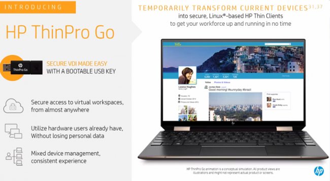 Компания HP представила любопытную новинку — небольшой USB-брелок ThinPro Go, который позволяет вдохнуть вторую жизнь в старый компьютер. Задача ThinPro Go заключается в формировании тонкого клиента на основе имеющегося в наличии ноутбука или настольного ПК. Для этого брелок достаточно подключить к порту USB той или иной системы. По сути, новинка представляет собой загрузочную флешку USB 3.0 вместимостью 32 Гбайт с предустановленной операционной системой НР ThinPro на базе Linux. Устройство совместимо практически с любым 64-битным компьютером на процессоре Intel или AMD, который несёт на борту хотя бы 2 Гбайт оперативной памяти. Приобрести ThinPro Go можно будет предстоящим летом по ориентировочной цене 135 долларов США. Кроме того, анонсирован новый мобильный тонкий клиент HP mt22 Mobile Thin Client, выполненный в формате ноутбука. Это устройство оснащено процессором Intel Celeron 5205U, сетевым Ethernet-контроллером, интерфейсом HDMI 1.4b, портами USB 3.1 Type-A, USB 3.1 Type-C, USB 2.0 и SD-ридером. Тонкий клиент рассчитан на подключение к удалённому серверу. Время автономной работы на одной подзарядке достигает 13 часов. Дисплей с диагональю 14 дюймов может иметь разрешение Full HD (1920 ? 1080 точек) или HD (1366 ? 768 пикселей). Объём ОЗУ составляет до 8 Гбайт, ёмкость флеш-накопителя — до 128 Гбайт. Модель HP mt22 Mobile Thin Client станет доступна уже в текущем месяце по цене от 495 долларов.
