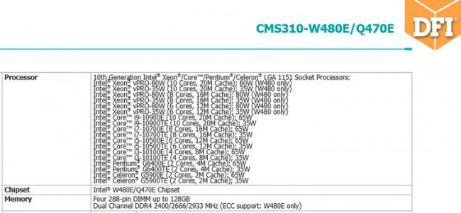 Компания Intel в последний день прошлого месяца представила новое поколение потребительских настольных процессоров, которые вошли в серию Comet Lake-S. Теперь же производитель промышленных и встраиваемых систем DFI раскрыл подробности о процессорах того же семейства, но для рабочих систем. DFI приводит список процессоров, которые будут использоваться в его системах на системной логике Intel W480 и Q470. И если чипсеты Q-серии и раньше присутствовали в ассортименте Intel для рабочих систем, то W480 стал дебютной системной логикой W-серии. Она предназначена для создания рабочих станций и позиционируется как нечто среднее между Q470 и Z490. Чипсет Intel W480 поддерживает технологию vPro и ряд других функций для удалённого управления системами, что будет полезно при использовании в системах крупных компаний. Компания DFI упоминает шесть моделей процессоров Xeon vPro, раскрывая их основные характеристики, но не уточняя названия конкретных моделей. Согласно представленным данным, Intel предложит по два шести-, восьми- и десятиядерных настольных процессора Xeon vPro. В каждой паре один из процессоров обладает пониженным до 35 Вт уровнем TDP, тогда как у другого этот показатель установлен в 80 Вт. Тактовые частоты, к сожалению, не уточняются, но они будут явно ниже частот потребительских Core. Также отмечается, что новые Xeon vPro будут работать только с платами на Intel W480. В том же списке фигурируют процессоры Intel Core E, Pentium E и Celeron E нового поколения, информация о которых уже представлена на официальном сайте Intel. В этих сериях предлагаются процессоры с количеством ядер от двух до десяти (с шагом в два ядра). Уровень TDP составляет 65 Вт для обычных моделей, и 35 Вт для моделей с обозначением «TE». Для обеспечения более низкого TDP были несколько уменьшены и частоты процессоров Core E по сравнению с потребительскими моделями.