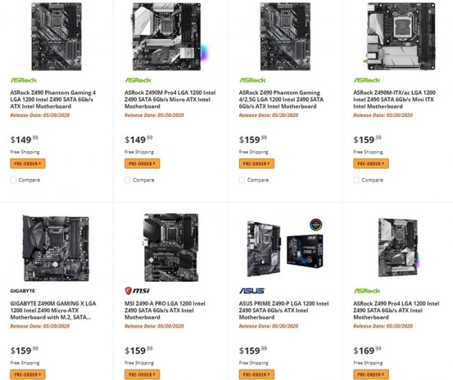 Сейчас американский магазин Newegg предлагает материнские платы на Intel Z490 от компаний ASRock, ASUS, MSI и Gigabyte. Всего ассортимент насчитывает 40 моделей. Стоимость самых доступных плат — ASRock Z490M Pro4, Z490 Phantom Gaming 4, а также ASUS Prime Z490M-Plus — составляет $150.