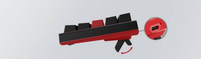 Двухступенчатые ножки клавиатуры позволяют устанавливать её под тремя разными углами, а кабель USB Type-C длиной 1,6 м легко отсоединяется, обеспечивая удобство переноски и износостойкость.