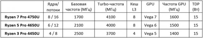Всего AMD представила три новые модели Ryzen Pro. Это четырёхъядерный Ryzen 3 Pro 4450U, шестиядерный Ryzen 5 Pro 4650U и восьмиядерный Ryzen 7 Pro 4750U. Все три процессора поддерживают SMT, то есть обеспечивают вдвое больше потоков, нежели имеют ядер. Базовые частоты процессоров составляют от 1,7 до 2,5 ГГц, а максимальные в режиме Boost достигают 3,7–4,1 ГГц.