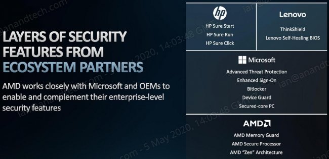Компания AMD сегодня представила новую серию мобильных процессоров — Ryzen Pro 4000, которые пополнили семейство 7-нм чипов Renoir на ядрах Zen 2. Новинки главным образом отличаются от вышедших ранее потребительских Ryzen 4000 лишь более продвинутыми возможностями для защиты информации. Всего AMD представила три новые модели Ryzen Pro. Это четырёхъядерный Ryzen 3 Pro 4450U, шестиядерный Ryzen 5 Pro 4650U и восьмиядерный Ryzen 7 Pro 4750U. Все три процессора поддерживают SMT, то есть обеспечивают вдвое больше потоков, нежели имеют ядер. Базовые частоты процессоров составляют от 1,7 до 2,5 ГГц, а максимальные в режиме Boost достигают 3,7–4,1 ГГц. Имеется у новинок и встроенная графика Vega второго поколения. Процессоры Ryzen 3 Pro 4450U, Ryzen 5 Pro 4650U и Ryzen 7 Pro 4750U обладает встроенными GPU соответственно с пятью, шестью и семью исполнительными блоками (320, 384 и 448 потоковых процессоров). Объём кеша третьего уровня составляет 4 или 8 Мбайт (у младшей и двух старших моделей соответственно), а на каждое ядро приходится по 512 Кбайт кеша второго уровня. Компания AMD отмечает значительный прирост производительности новинок по сравнению с прошлым поколением мобильных чипов Ryzen Pro. Производитель называет Ryzen 7 Pro 4750U самым быстрым процессором для ультратонких бизнес-ноутбуков. Также заявляется высокая энергоэффективность: тот же Ryzen 7 Pro способен обеспечить более 20 часов автономной работы в «системах премиум-класса». Отмечается высокая степень защищённости новых процессоров от кражи данных. AMD указывает на защиту на каждом уровне от кристалла до операционной системы, а также защиту памяти. Ещё в бизнес-сфере окажутся полезны расширенные возможности новых чипов для удалённого управления, а также высокий уровень качества и стабильности.