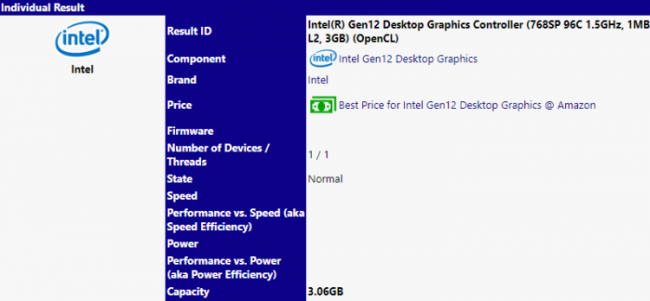 Ускоритель представляет собой интегрированный мобильный графический адаптер, переработанный в настольный. Тест OpenCL, в котором он был определён как «мобильный графический контроллер Intel 12-го поколения», также указывает на это. Это говорит о том, что DG1, построенная на чипе Xe LP, является видеокартой начального уровня.