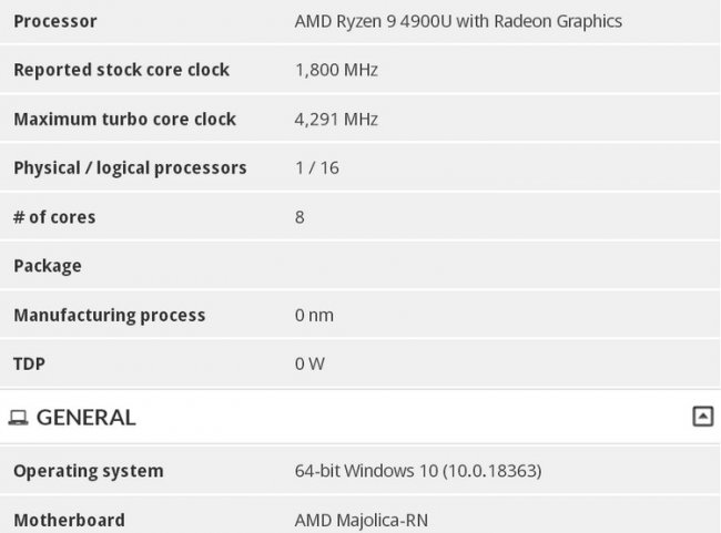 Согласно спецификациям, определённым тестом 3DMark, процессор Ryzen 9 4900U имеет восемь ядер и шестнадцать потоков. Базовая тактовая частота новинки составляет всего 1,8 ГГц, как и у нынешнего флагмана этого семейства — восьмиядерного Ryzen 7 4800U. А вот максимальная тактовая частота Ryzen 9 4900U достигает 4,3 ГГц, что на 100 МГц выше, чем у доступной сейчас старшей модели.