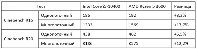 Несмотря на это, Ryzen 5 3600 в Cinebench R15 и R20 уверенно обходит новинку Intel как в однопоточной, так и многопоточной нагрузках. Наибольшая разница до 17 % наблюдается в многопоточных тестах.