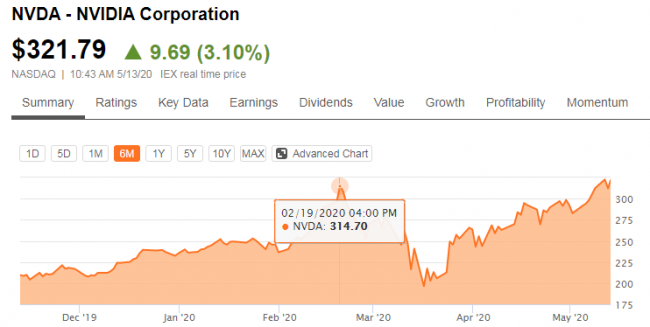 Вчерашнее явление основателя NVIDIA в роли кулинара, способного в домашних условиях изготовить систему на базе восьми ускорителей вычислений нового поколения, предсказуемо добавило оптимизма инвесторам. Аналитики теперь убеждены, что завтра будет представлена графическая архитектура Ampere, а доходы NVIDIA в игровом и серверном сегментах устремятся вверх. Информация сайта - «dima-gid.ru» Специалисты Wedbush, в частности, подняли прогноз по курсу акций NVIDIA с $311 до $340 при текущем значении $320,37. По словам аналитиков, завтрашний дебют графических процессоров с архитектурой Ampere окажет сильную поддержку котировкам акций NVIDIA. Информация сайта - «dima-gid.ru» Этим дело не ограничится — на 21 мая назначена квартальная отчётная конференция NVIDIA. Первый фискальный квартал должен порадовать инвесторов хорошими показателями, а прогноз на ближайшие месяцы в игровом и серверном сегментах наверняка будет благоприятным. Надо сказать, что после мощной просадки в середине марта акции NVIDIA смогли отыграть потери, обновив на днях 52-недельный максимум, и подорожав за пару месяцев на 64 %. Впрочем, в середине февраля они стоили лишь немногим меньше, чем сейчас.