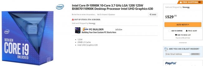 На старте продаж магазины будут предлагать довольно ограниченный ассортимент настольных процессоров Intel Core десятого поколения. Конечно же, в первых рядах не могло не оказаться флагманского десятиядерника Core i9-10900K, который доступен у наибольшего числа ретейлеров.