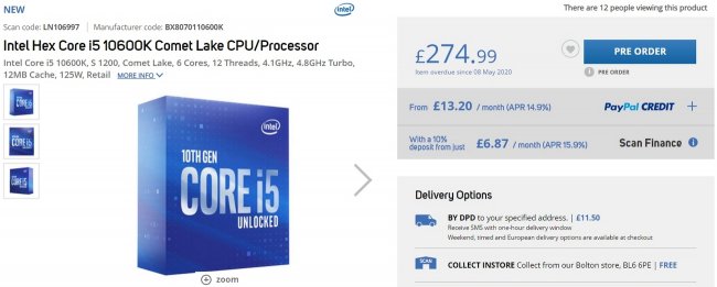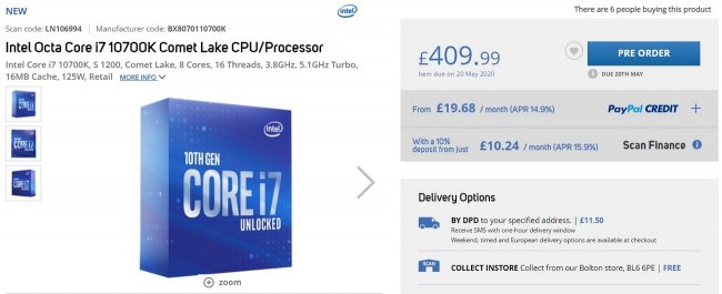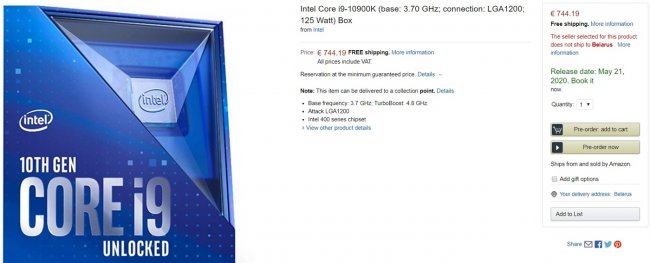 Представленные в конце прошлого месяца настольные процессоры Intel Comet Lake-S поступят в продажу 20 мая. И за неделю до релиза крупные зарубежные онлайн-магазины начали принимать предварительные заказы на грядущие новинки, тем самым раскрыв их розничные цены.