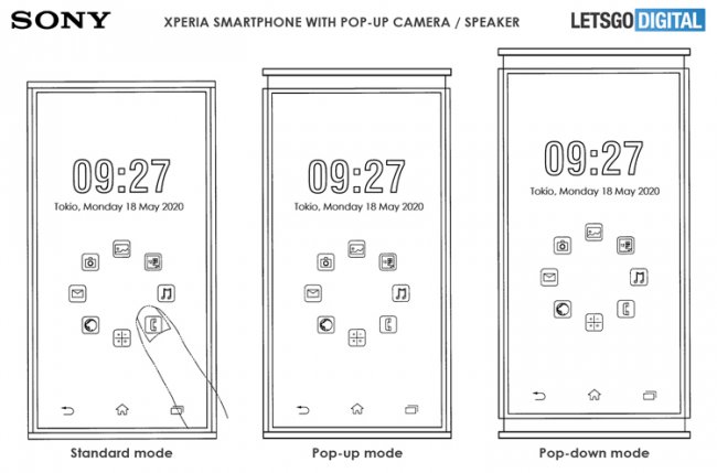 Sony размышляет над аппаратом с полностью безрамочным экраном. Конструкция предусматривает наличие двух выдвижных модулей — в верхней и нижней частях. Причём эти моторизованные блоки будут иметь размер во всю ширину корпуса.