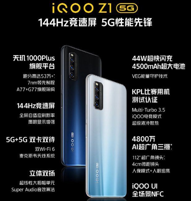 Модель iQOO Z1 5G располагает 6,57-дюймовым дисплеем на матрице IPS с разрешением 2400 ? 1080 точек (формат Full HD+). Панель обладает частотой обновления в 144 Гц; говорится о поддержке HDR10. Фронтальная 16-мегапиксельная камера расположилась в небольшом отверстии в правом верхнем углу экрана. Тройная тыльная камера вобрала в себя 48-Мп основной датчик, 8-Мп блок с широкоугольной оптикой и 2-Мп макромодуль.