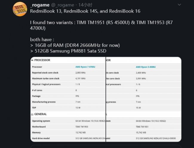 Несколько недель назад в Сеть просочилась информация о том, что Xiaomi планирует выпустить три новых ноутбука под брендом Redmi. Теперь известный сетевой источник, скрывающийся под ником @_rogame, поделился в своём Twitter-аккаунте некоторыми подробностями о готовящихся к выпуску RedmiBook. Информация сайта - «dima-gid.ru» Согласно опубликованным данным, обновлённое семейство будет включать в себя ноутбуки с диагоналями 13, 14 и 16 дюймов. Инсайдер опубликовал сведения о двух моделях. Как сообщается, они получат процессоры AMD Ryzen 4000-й серии и твердотельные накопители Samsung PM881. Одна из моделей получит чип Ryzen 4500U, а другая будет оснащаться Ryzen 4700U. Первый представляет собой шестиядерный шестипоточный чип, второй имеет восемь физических ядер, которые способны обрабатывать восемь логических потоков. Обе конфигурации оснащаются 16 Гбайт оперативной памяти и SSD-накопителями ёмкостью 512 Гбайт. Информация сайта - «dima-gid.ru» RedmiBook 14 и 16 Ryzen Edition уже прошли сертификацию Bluetooth SIG. Ноутбуки RedmiBook 13 14S и 16 уже доступны для бронирования на торговой площадке JD.com, где указано, что они поступят в продажу 26 мая.
