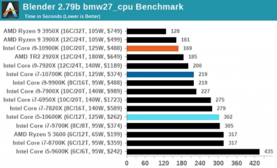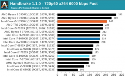 Работа с архивами в 7-Zip показала аналогичную картину: Core i9-10900K немного не дотянул до Ryzen 9 3900X, тогда как в WinRar чип Intel оказался быстрее. При кодировании и декодировании видео в Handbrake процессор Intel максимально приблизился к 16-ядерному Ryzen 9 3950X при использовании кодека HEVC, а вот с более старым x264 оказался немного медленнее Ryzen 9 3900X.
