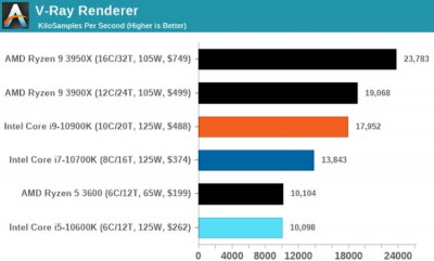 Сегодня в продажу поступили первые процессоры Intel Core десятого поколения (Comet Lake-S), и профильные западные ресурсы опубликовали обзоры некоторых из новинок. 3DNews, к сожалению, похвастаться подобным не может по независящим от нас причинам, поэтому ниже проведён обзор западной прессы. Начнём, конечно же, с флагмана новой серии — Core i9-10900K. Данный процессор обладает десятью ядрами, двадцатью потоками и 20 Мбайт кеша третьего уровня. Базовая частота чипа составляет 3,7 ГГц, а максимальная частота при автоматическом разгоне достигает 5,3 ГГц. Как и все другие чипы семейства Comet Lake, новинка построена на микроархитектуре Skylake и выполнена по 14-нм техпроцессу. Процессор Core i9-10900K ожидаемо показывает весьма высокий уровень производительности как в играх, так и в рабочих задачах. В рендеринге 3D-графики новинка Intel максимально приблизилась к своему прямому конкуренту в лице Ryzen 9 3900X при использовании большинства рендереров, а в POV-Ray 3.7.1 и вовсе смогла оказаться впереди. Примечательно, что 10-ядерная новинка Intel оказалась быстрее 12-ядерного Core i9-7920X. Тесты в рабочих задачах Core i9-10900K Intel_Core_i9-10900K_11.jpg Смотреть все изображения (9) Intel_Core_i9-10900K_10.jpg Intel_Core_i9-10900K_09.jpg Intel_Core_i9-10900K_08.jpg Intel_Core_i9-10900K_07.jpg Intel_Core_i9-10900K_06.jpg Intel_Core_i9-10900K_05.jpg Intel_Core_i9-10900K_04.jpg Intel_Core_i9-10900K_03.jpg Смотреть все изображения (9) Работа с архивами в 7-Zip показала аналогичную картину: Core i9-10900K немного не дотянул до Ryzen 9 3900X, тогда как в WinRar чип Intel оказался быстрее. При кодировании и декодировании видео в Handbrake процессор Intel максимально приблизился к 16-ядерному Ryzen 9 3950X при использовании кодека HEVC, а вот с более старым x264 оказался немного медленнее Ryzen 9 3900X. Игровые тесты Intel Core i9-10900К в разрешении Full HD Intel_Core_i9-10900K_16.jpg Смотреть все изображения (5) Intel_Core_i9-10900K_15.jpg Intel_Core_i9-10900K_14.jpg Intel_Core_i9-10900K_13.jpg Intel_Core_i9-10900K_12.jpg Смотреть все изображения (5) В игровых тестах Core i9-10900K показал не всегда однозначные результаты, но в основном он оказался производительнее предшественников и конкурентов. Так, в разрешении Full HD (1920 ? 1080 точек) новинка оказалась безоговорочным лидером, оторвавшись даже от «суперфлагмана» прошлого поколения Core i9-9900KS в среднем на 2–3 %. Игровые тесты Intel Core i9-10900К в разрешении 4K Intel_Core_i9-10900K_22.jpg Смотреть все изображения (5) Intel_Core_i9-10900K_21.jpg Intel_Core_i9-10900K_20.jpg Intel_Core_i9-10900K_19.jpg Intel_Core_i9-10900K_18.jpg Смотреть все изображения (5) А вот в более высоком разрешении 4K (3840 ? 2160 точек) процессор Core i9-10900K почему-то уступил соперникам во многих тестах. Местами он проиграл даже шестиядерным Core i5-9400F и Core i5-10600K. Более того, в отдельных ситуациях производительнее нового флагмана Intel оказался и народный AMD Ryzen 5 3600. Тем не менее, в среднем быстродействие нового процессора Intel Core i9-10900K оказалась на очень высоком уровне. После множества слухов и шокирующих предположений по поводу энергетических аппетитов, мы не смогли обойти стороной вопрос тепловыделения и потребления Core i9-10900K. Новинка оказалась и вправду весьма прожорливой: в простое вся система с этим процессором потребляла 53 Вт, а под нагрузкой — 278 Вт. Аналогичная конфигурация на Core i9-9900K потребляла 36 и 210 Вт соответственно, а на Ryzen 9 3900X — 43 и 198 Вт соответственно. По данным другого источника, новый чип Intel действительно способен в одиночку затребовать до 254 Вт энергии. Что касается рабочих температур, то под нагрузкой Core i9-10900K нагревается вплоть до 92 °C. Правда, здесь источник не уточняет, какая именно система охлажде