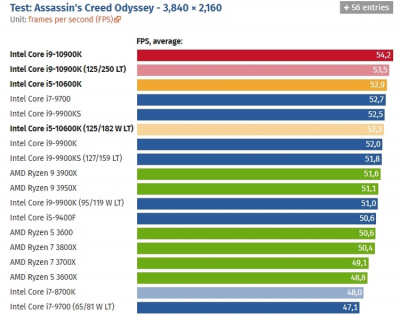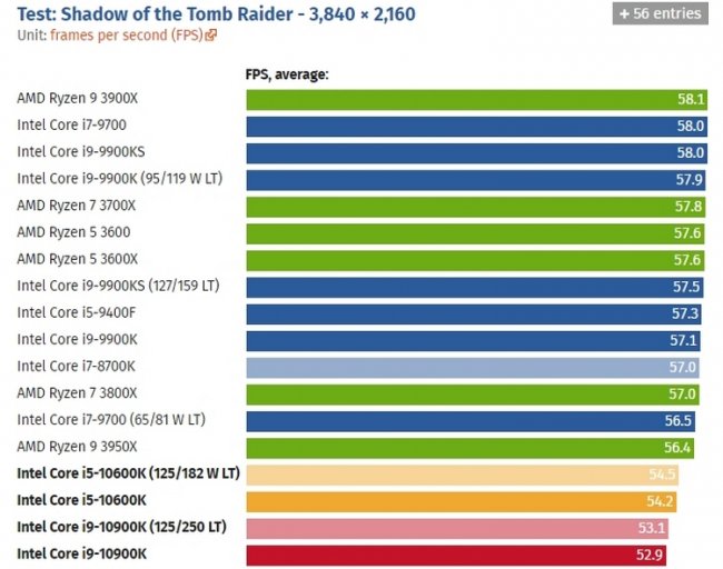 А вот в более высоком разрешении 4K (3840 ? 2160 точек) процессор Core i9-10900K почему-то уступил соперникам во многих тестах. Местами он проиграл даже шестиядерным Core i5-9400F и Core i5-10600K. Более того, в отдельных ситуациях производительнее нового флагмана Intel оказался и народный AMD Ryzen 5 3600. Тем не менее, в среднем быстродействие нового процессора Intel Core i9-10900K оказалась на очень высоком уровне.