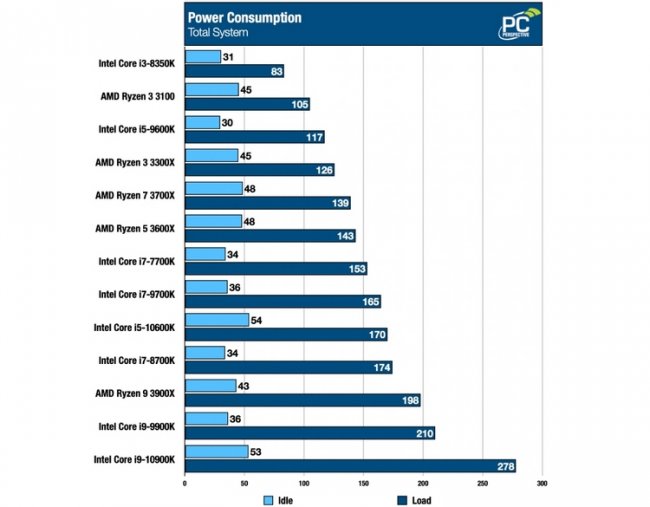 После множества слухов и шокирующих предположений по поводу энергетических аппетитов, мы не смогли обойти стороной вопрос тепловыделения и потребления Core i9-10900K. Новинка оказалась и вправду весьма прожорливой: в простое вся система с этим процессором потребляла 53 Вт, а под нагрузкой — 278 Вт. Аналогичная конфигурация на Core i9-9900K потребляла 36 и 210 Вт соответственно, а на Ryzen 9 3900X — 43 и 198 Вт соответственно. По данным другого источника, новый чип Intel действительно способен в одиночку затребовать до 254 Вт энергии.