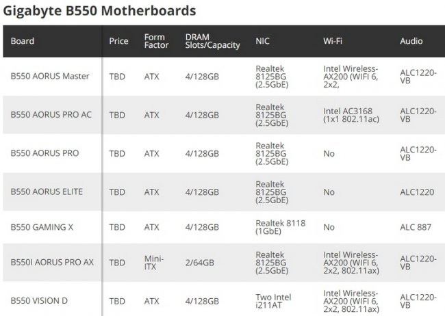 Наиболее продвинутая новинка — B550 Aorus Master — способна предложить продвинутое оснащение в виде усиленной подсистемы питания с 16 фазами, трёх слотов M.2 с радиаторами, портов USB 3.2 Gen2 Type-C и многого другое. Все представленные новинки семейства Aorus оснащены 2,5-гигабитными сетевыми интерфейсами Realtek 8125BG, а некоторые из них к тому же могут похвастаться наличием беспроводных модулей Intel с поддержкой Wi-Fi 5 или 6. В то же время модель B550 Vision D может похвастаться парой гигабитных сетевых интерфейсов Intel.