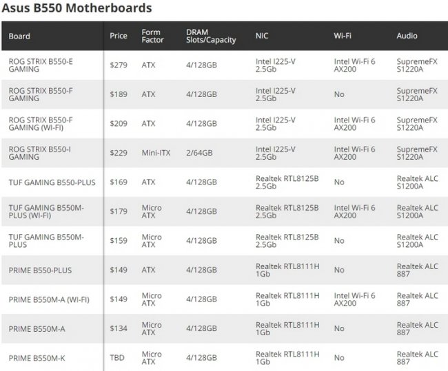 Компания ASUS подготовила сразу 11 новинок в сериях ROG Strix, TUF Gaming и Prime. Платы серии ROG Strix отличаются наилучшим оснащением, но также характеризуются и высокой стоимостью. Они предлагают усиленные подсистемы питания, 2,5-гигабитные сетевые интерфейсы Intel I225-V и звуковые подсистемы на кодеке SupremeFX S1220A. У большинства моделей есть также и модули Intel Wi-Fi 6 AX200. Стоимость материнских плат ASUS B550 ROG Strix составляет от $190 до $280.