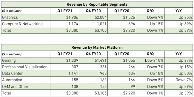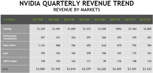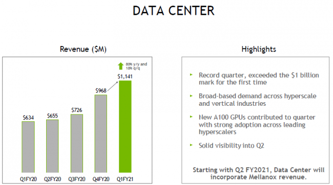 Первый квартал нового фискального года в календаре NVIDIA завершился 26 апреля. Как и рассчитывали аналитики, компания продемонстрировала впечатляющую сумму выручки в серверном сегменте, которая выросла на 80 % до $1,14 млрд. Игровое направление тоже не подвело, поскольку выручка на нём выросла на 27 % в сложных условиях пандемии. Совокупная выручка компании выросла на 39 %.