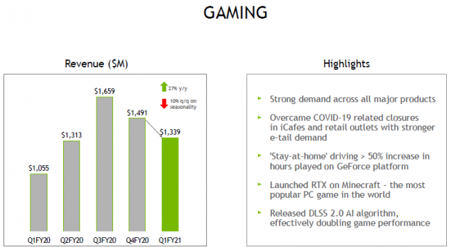 Выручку на игровом направлении NVIDIA в минувшем квартале удалось увеличить на 27 % в годовом сравнении. Отмечается, что повышенным спросом пользовались все основные продукты. Закрытие интернет-кафе в Китае и офлайн-магазинов удалось компенсировать возросшим спросом в интернет-магазинах. Самоизоляция способствовала более чем полуторакратному росту игровых часов среди пользователей GeForce.