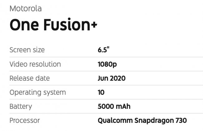 Интернет-источники обнародовали рендеры и ключевые технические характеристики смартфона среднего уровня Motorola One Fusion Plus, официальный анонс которого ожидается в следующем месяце. Сообщается, что аппарат получит дисплей размером 6,5 дюйма по диагонали. Будет применена панель формата 1080р. В тыльной части можно видеть четверную камеру с оптическими элементами, выстроенными в ряд по вертикали. Указано разрешение основного сенсора — 64 млн пикселей. В логотип Motorola интегрирован сканер отпечатков пальцев. В основу смартфона якобы ляжет процессор Snapdragon 730. Чип объединяет восемь вычислительных ядер Kryo 470 с тактовой частотой до 2,2 ГГц, графический контроллер Adreno 618 и сотовый модем Snapdragon X15 LTE. Ранее говорилось о наличии 4/6 Гбайт оперативной памяти и флеш-накопителя ёмкостью 64/128 Гбайт. Питание обеспечит аккумуляторная батарея ёмкостью 5000 мА·ч. Новинка будет поставляться с операционной системой Android 10. Сведений об ориентировочной цене пока нет.