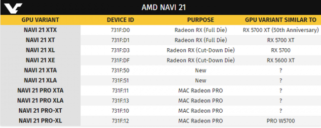 Известный блогер rogame со страниц ресурса HardwareLeaks поделился информацией о предполагаемом ассортименте графических решений AMD на базе видеочипа Navi 21, который принято считать флагманским продуктом нового поколения. Представители сайта VideoCardz систематизировали эту информацию, и от разнообразия модификаций при взгляде на таблицу голова идёт кругом. Первоисточник приписывает Navi 21 наличие 5120 потоковых процессоров и площадь кристалла около 505 мм2.