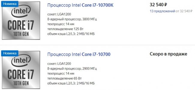 Куда более привлекательной стоимостью обладает восьмиядерный Core i7-10700K. Как указывает Яндекс.Маркет, его можно найти в российской рознице по цене от 32 540 рублей. В свою очередь Core i7-10700 в продажу пока не поступил. Заметим, что прежний флагман — Core i9-9900K, который по характеристикам соответствует Core i7-10700K, продаётся дороже — почти за 36 тыс. рублей.