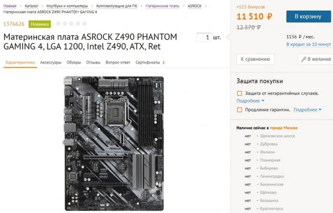 Материнские платы для новых процессоров с разъёмом LGA 1200 также можно найти в российских магазинах. Пока правда, выбор ограничивается исключительно моделями на старшей системной логике Intel Z490. Стоимость наиболее доступных моделей в магазине «Ситилинк» начинается с отметки в 11,5 тыс. рублей. Самой же дорогой из найденных нами на данный момент оказалась плата MSI MEG Z490 ACE стоимостью более 49 тыс. рублей.