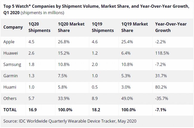 Если рассматривать только сегмент «умных» наручных часов, то здесь «золото» также досталось Apple — 26,8 % в общем объёме поставок в штучном выражении. Вслед за «яблочной» империей идут Huawei, Samsung, Garmin и Huami с долями 15,2 %, 10,8 %, 7,5 % и 5,8 % соответственно.