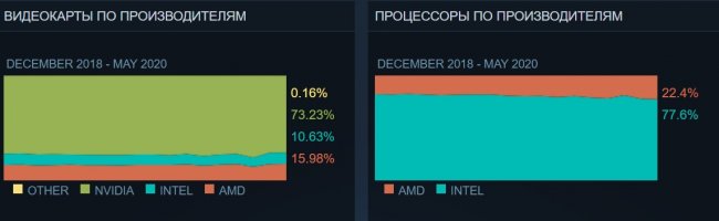 Steam опубликовал результаты мониторинга оборудования, проведённого в мае 2020 года. Компания собрала информацию об аппаратном обеспечении, используемом в компьютерах геймеров по всему миру. Согласно этим данным, AMD продолжает укреплять свои позиции на рынке процессоров. Информация сайта - «dima-gid.ru» Конечно, стоит учесть, что собранная Steam статистика отображает данные только по компьютерам, на которых установлено приложение фирменного магазина компании. Однако учитывая его высокую популярность, она даёт достаточно правдоподобную картину. Судя по этой статистике, ПК-геймеры медленно, но верно переходят с процессоров Intel на решения AMD. Статистика за май показывает, что, Intel по-прежнему занимает лидирующие позиции на рынке. 77,54 % пользователей Steam используют процессоры Intel, однако их доля снизилась на 0,74 % за последний месяц в пользу компании AMD. Хотя это снижение может на первый взгляд показаться незначительным, у «синих» есть причины для беспокойства. Дело в том, что компания теряет позиции на рынке с каждым месяцем. Исключением стал лишь март. Кроме того отметим, что популярность набирают шестиядерные процессоры, доля которых по итогам мая составила 22,8 %. Самыми популярными остаются четырёхъядерные чипы, но постепенно их доля сокращается, равно как и двухъядерных. И хотя рост популярности фирменных процессоров не может не радовать AMD, на рынке видеокарт дела компании идут не так хорошо. Здесь абсолютное лидерство принадлежит NVIDIA. Девять из десяти самых часто используемых в геймерских сборках видеоускорителей принадлежат к семейству GeForce. Самой популярной среди ПК-Геймеров остается GTX 1060. Единственная видеокарта AMD, которая попала в десятку лидеров — это Radeon RX 580. Фактически, AMD занимает лишь 15,98 % рынка игровых GPU, в то время как Intel, которая создаёт только интегрированные видеочипы, используется в 10,63 % компьютеров пользователей Steam. Информация сайта - «dima-gid.ru» Кроме того, майская статистика сообщает, что большинство геймеров (63,51 %) по-прежнему использует мониторы с разрешением Full HD. Следующим по популярности (10,91 %) является довольно низкое разрешение 1366 ? 768 точек, которое часто используется в бюджетных ноутбуках. И только 2,17% пользователей Steam играют на мониторах с разрешением 4К. Что касается программного обеспечения, абсолютным лидером является 64-разрядная Windows 10, которая установлена на 85,58 % компьютеров геймеров. Второй наиболее часто используемой операционной системой является Windows 7, доля которой в мае выросла на 0,61 %, несмотря на то, что Microsoft прекратила её поддержку ещё в январе.