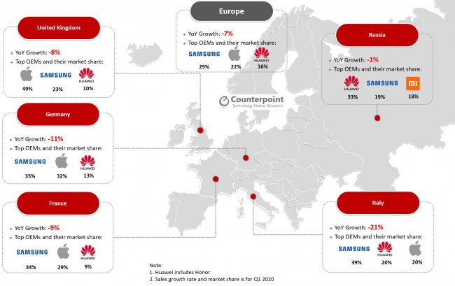 Крупнейшим поставщиком смартфонов в Европе по итогам прошлого квартала стала компания Samsung с долей в 29 % против 31 % годом ранее. На втором месте находится Apple, занявшая 22 % рынка (21 % в первой четверти 2019-го). Замыкает тройку Huawei с дочерним брендом Honor, чья доля уменьшилась за год с 23 % до 16 %.
