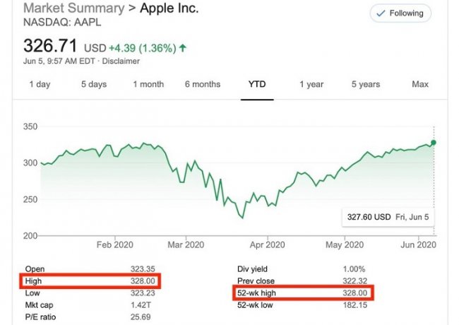Предыдущая максимальная стоимость акций Apple была зафиксирована 29 января текущего года и составила $327,85. За сегодняшний день их цена поднялась с $323,23 до $328 и продолжает расти. Заметим, что 23 марта стоимость акций Apple упала до $212,61, после чего демонстрировала постоянный стабильный рост. Вероятно, этому поспособствовал выпуск множества обновлённых продуктов, которые были весьма тепло приняты пользователями. Помимо этого, на фоне пандемии коронавируса, вследствие перехода большинства людей на удалённую работу и дистанционное обучение, спрос на планшеты и ноутбуки компании вырос до такой степени, что в Азии начал назревать дефицит этих устройств.