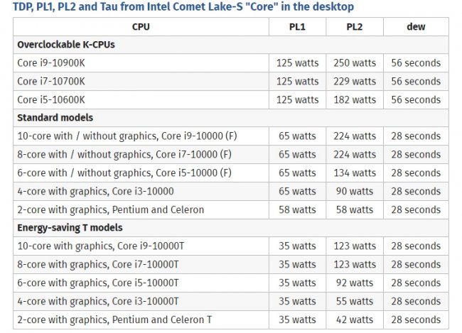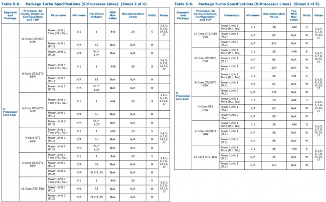 Как можно заметить, изменениям подверглись все таблицы, в которых Intel указывала пределы PL1 и PL2 для представителей настольного семейства Comet Lake-S.