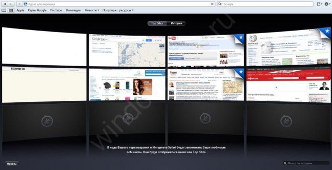 Сафари в этом отношении мало отстает. Внешне оформление немного отличается. Строка для ввода адреса находится в центральной части, а управляющие кнопки/ссылки находятся слева, справа и под низом. Путем настроек Сафари можно внести следующие изменения:
