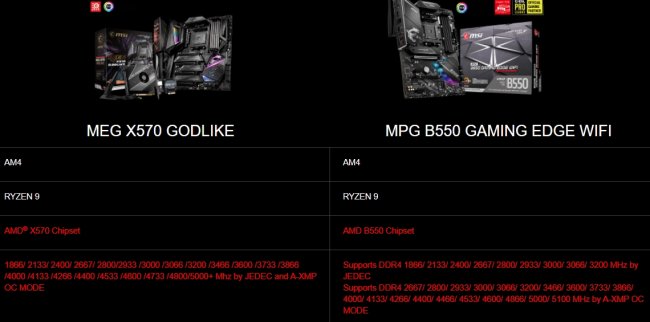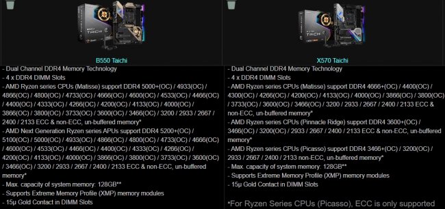 Например, компания ASRock для новой платы B550 Taichi заявляет поддержку модулей памяти с частотой выше 5000 МГц при работе с процессорами Ryzen 3000 (Matisse). В свою очередь для «следующего поколения APU Ryzen», то есть чипов Renoir, и вовсе заявлена поддержка режима DDR4-5200+. В то же время для X570 Taichi производитель указывает совместимость лишь с модулями DDR4-4666. Во всех случаях, конечно же, речь идёт о работе памяти в разгоне.