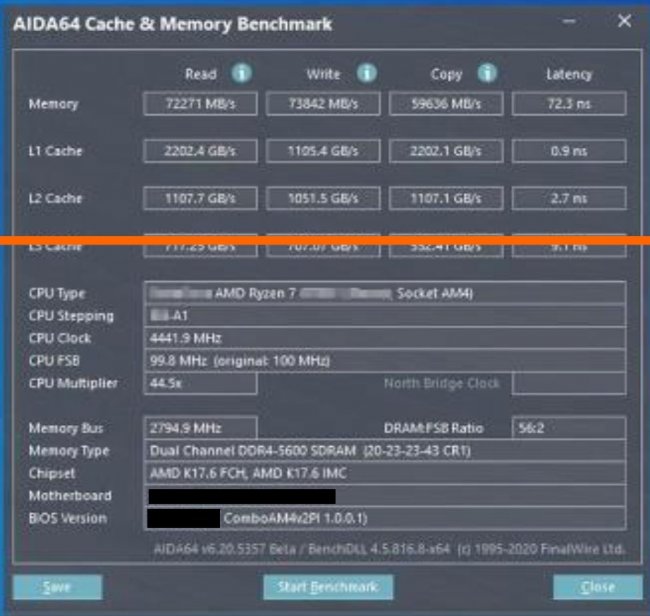К сожалению, о модели материнской платы, на базе которой была построена система с гибридным чипом AMD источник ничего не сообщает. Однако он указывает, что производительность оперативной памяти стандарта DDR4 с таймингами CL20 при таком показателе частоты проверили в синтетическом тесте AIDA64.