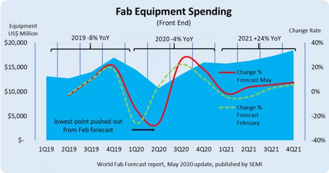 Следует сказать, что пандемия коронавируса SARS-CoV-2 заставила аналитиков пересмотреть данный ранее прогноз по инвестициям в заводы (выше на графике новый прогноз показан красной линией). В частности, затраты на производственное оборудование сместились с первого квартала на второй квартал 2020 года. В первом квартале глобальные инвестиции в полупроводниковое производство последовательно сократились на 15 %. Во втором квартале мир начал оживать после первого шока от пандемии и карантина. Дополнительно спрос на оборудование во втором квартале может быть подогрет опасениями о санкциях против китайских компаний.