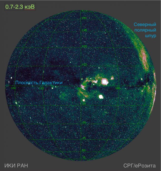 Рентгеновский телескоп с оптикой косого падения eROSITA сформировал карту всей небесной сферы, площадь которой составляет 41 тысячу 253 квадратных градуса. Изображения половины неба, за обработку и анализ которой отвечают российские астрофизики, приведены на иллюстрациях: показаны карты (нажмите для увеличения) в двух энергетических диапазонах — 0,3–0,7 кэВ и 0,7–2,3 кэВ.