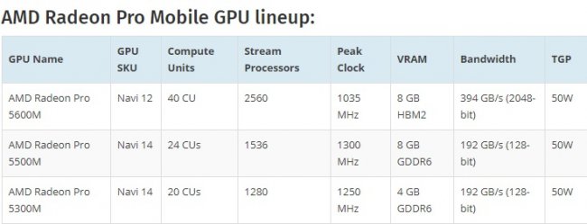 Компания AMD анонсировала выпуск мобильных графических ускорителей Radeon Pro 5600M для ноутбуков Apple MacBook Pro. Построенные архитектуре RNDA, видеокарты Radeon Pro 5600M являются первыми мобильными графическими решениями AMD, использующими высокопроизводительную видеопамять стандарта HBM2, вместо традиционной GDDR6, которая применяется в остальных видеокартах 5000-й серии.