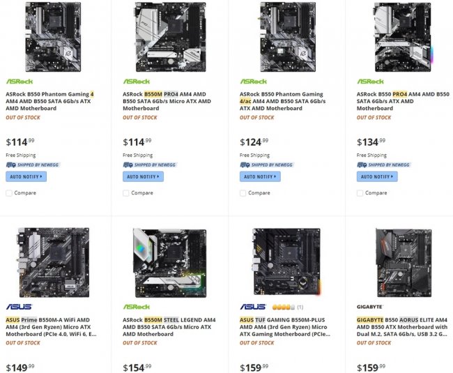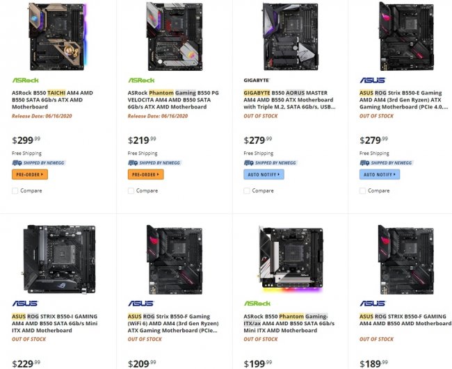 Компания AMD во время анонса системной логики B550 заявляла, что производители материнских плат предложат более 60 моделей на новом чипсете. На данный момент магазины предлагают куда меньший ассортимент, но постепенно он наверняка будет расширяться. В частности, на виртуальном прилавке американского Newegg сейчас имеется 25 моделей материнских плат на B550.